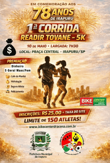 A 1ª Corrida READIR TOVANE – 5K chega para marcar as comemorações do aniversário de 78 anos de Irapuru/SP com um evento esportivo que une saúde, superação e integração entre atletas e comunidade.