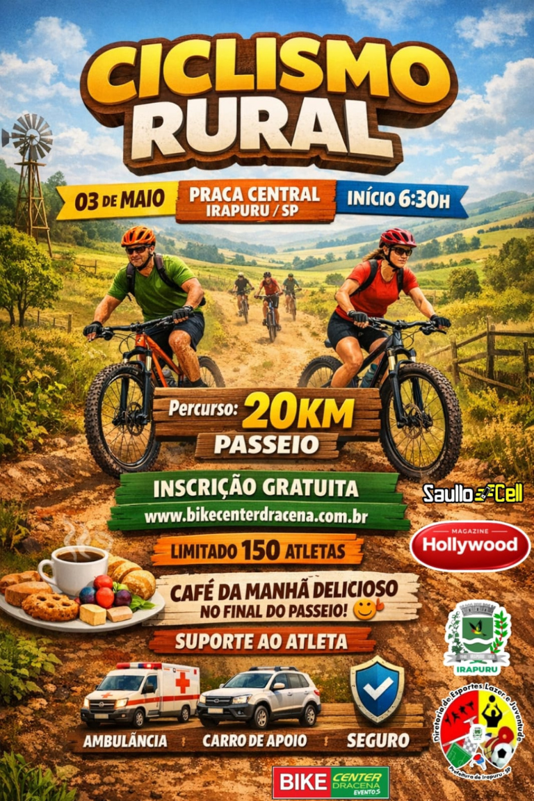 Prepare sua bike, convide os amigos e venha viver uma experiência única em meio à natureza! Em comemoração ao aniversário de Irapuru, você está convidado para um passeio ciclístico especial, repleto de energia, saúde e conexão.